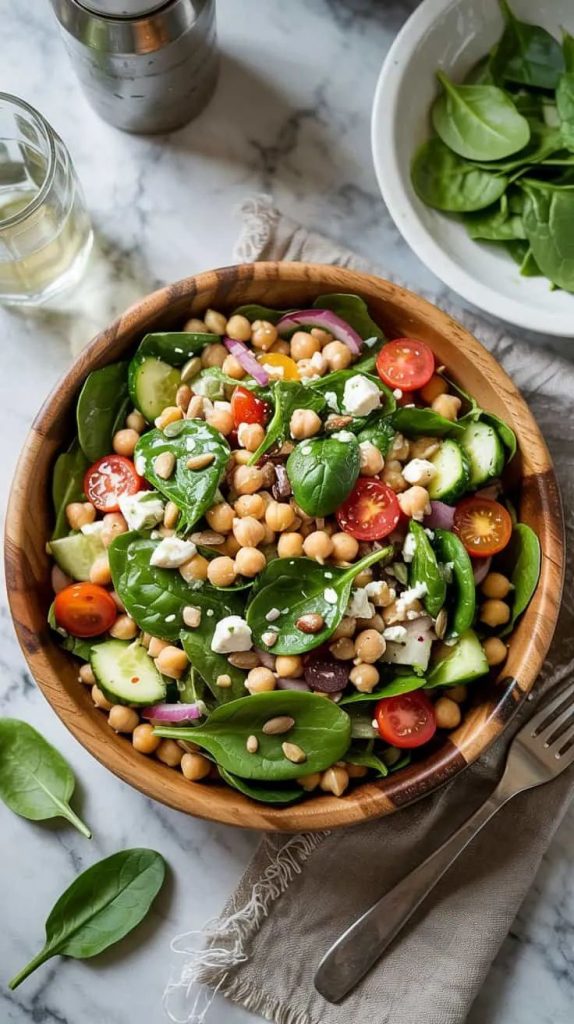 Ensalada de garbanzos con tomate, pepino, aceitunas y aceite de oliva.